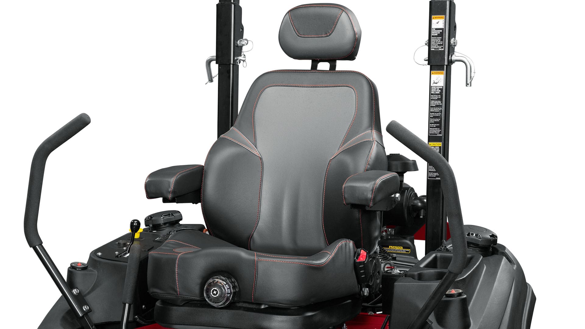 Mow in superior comfort with arm rests, multi-position head rest, adjustable lumbar and seat recline